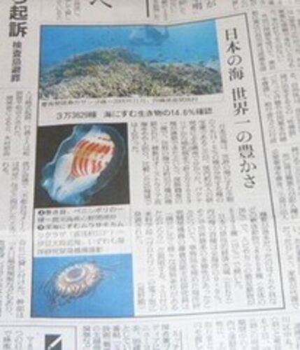 今日の 朝日新聞の 朝刊から 写真を スキャンしようと思ったんだけど すいません デジカメで撮ってしまいました 「 日本の海 世界一の豊かさ 」 パッ 目に付いた話題です 日本近海は世界にすむ 生物のうちの14.6%の種が 分布する種の宝庫であることが …